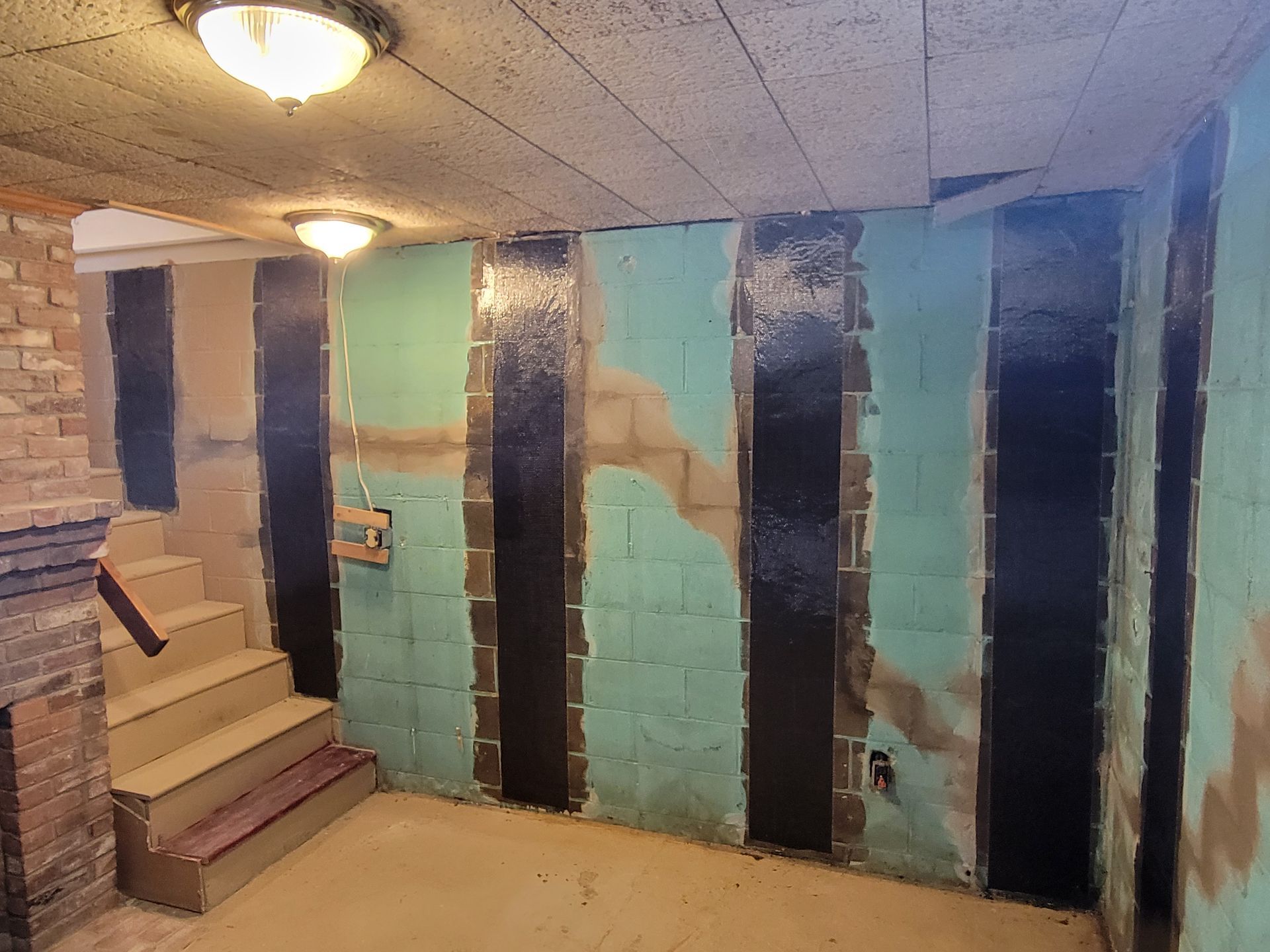 To repair block foundations, we repoint the mortar joints where applicable and use carbon fiber strapping reinforcement to add significant strength to bowing block walls or step cracks.