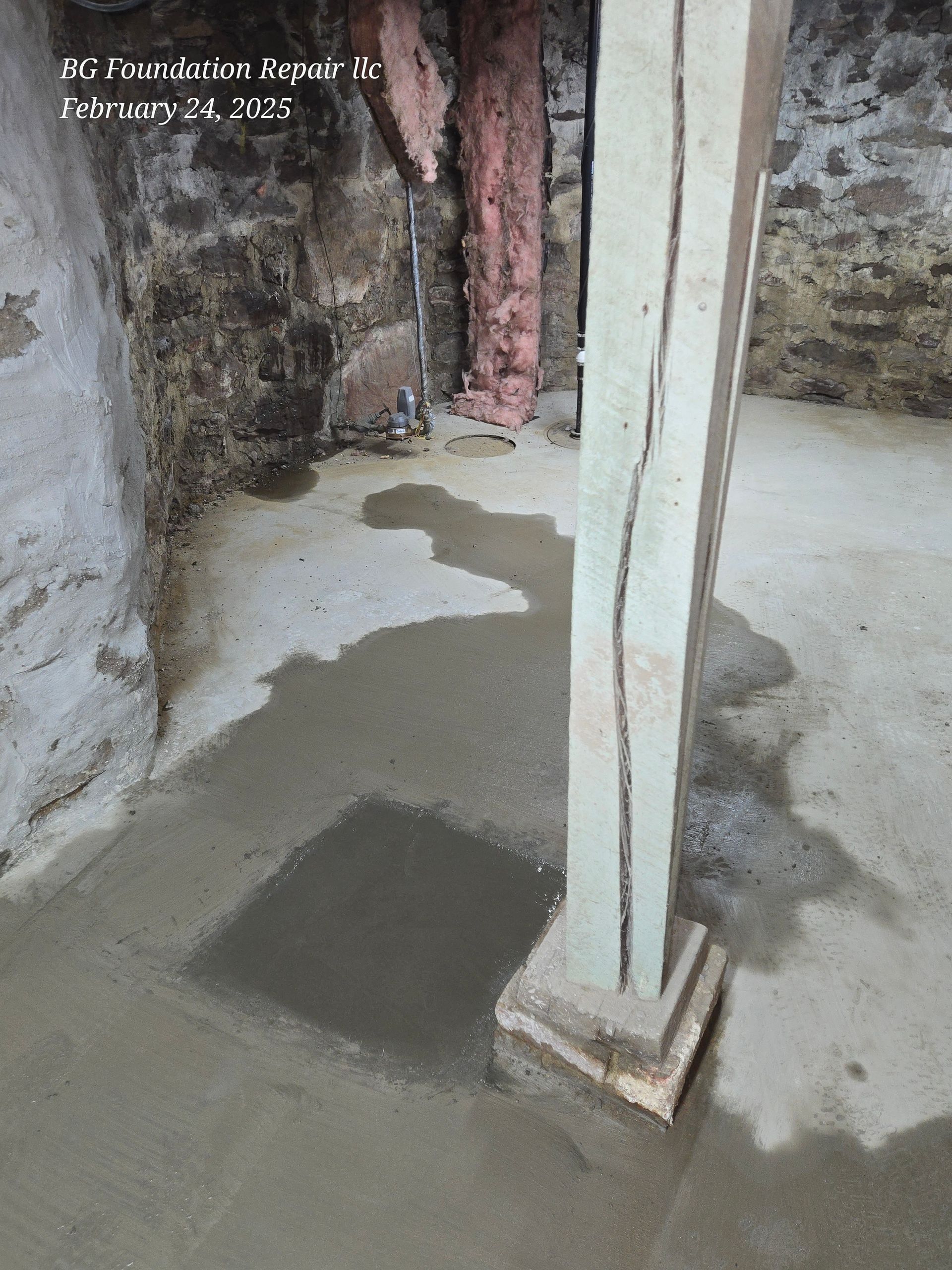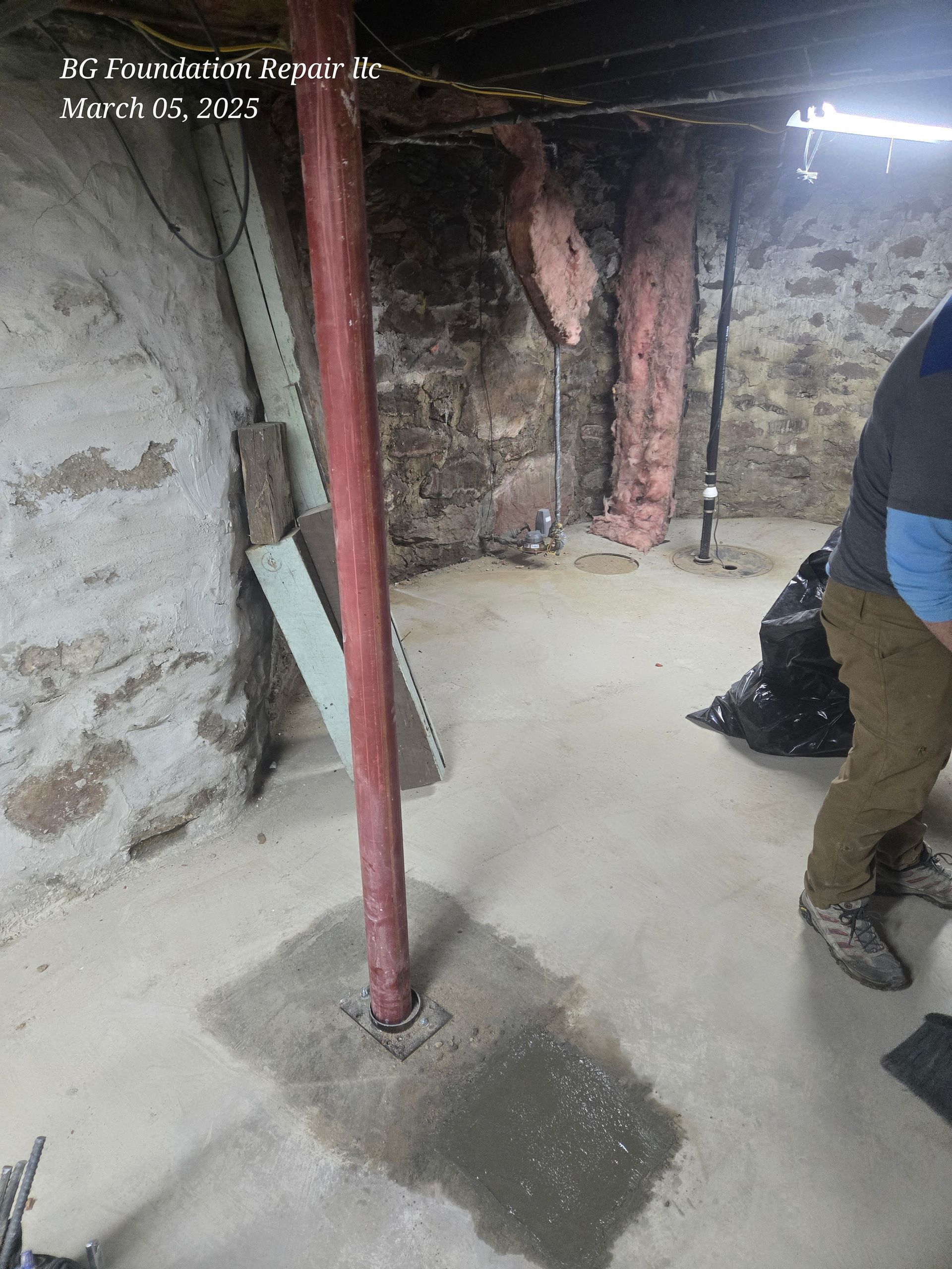 We can remove old support columns and replace them with cement-filled steel lally columns fixed with steel mounting plates and, if necessary, new footing or footer to support the column.