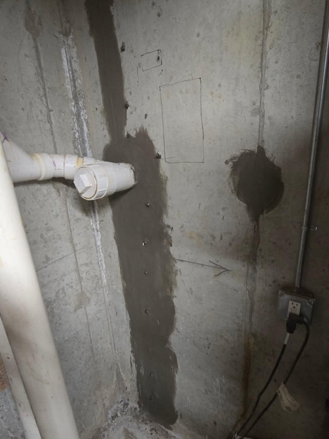 We fill the void space around the pipe penetration with a dry fibrous rope-like material (oakum) that we soak in our water-stopping, expanding polymer resin. We will then apply a new hydraulic cement cap.